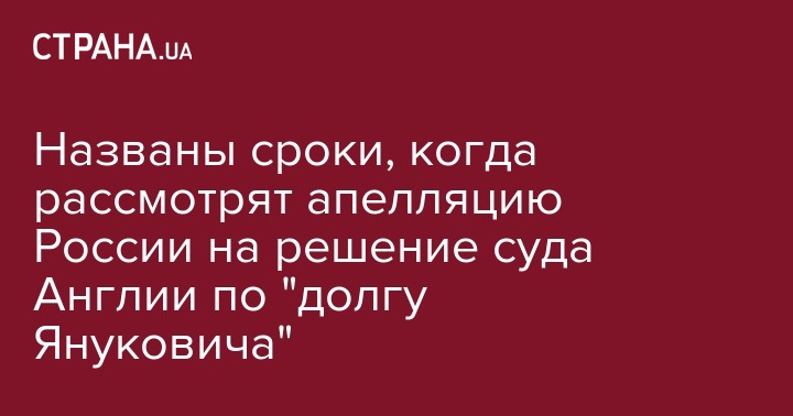 Начало рассмотрения апелляции России на решение Апелляционного суда Англии о споре между Москвой и Киевом о $3 млрд "долга Януковича", ожидается не ранее июня 2019 года. Об этом сообщила пресс-служба Минфина РФ, пишет Интерфакс. Рассмотрение апелляции состоится в Верховном суде Великобритании.