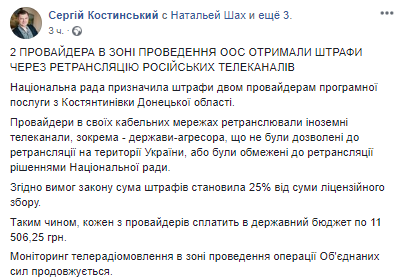 "Провайдеры в своих кабельных сетях ретранслировали иностранные телеканалы, в частности - государства-агрессора, которые не были разрешены к ретрансляции на территории Украины, или были ограничены к ретрансляции решениями Национального совета", - объяснил член Нацсовета Сергей Костинский в Facebook.