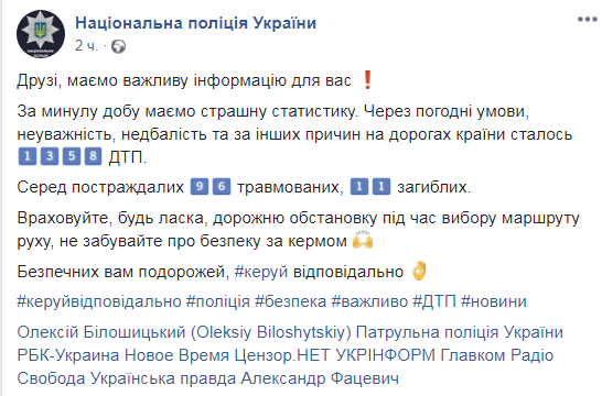 "За минувшие сутки имеем страшную статистику. Из-за погодных условий, невнимательность, небрежность и других причин на дорогах страны произошло 1358 ДТП", - говорится в сообщении.