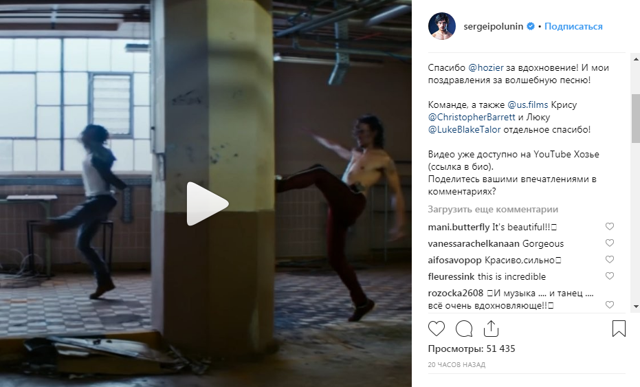 Звезда балета из Украины мирового масштаба, танцовщик Сергей Полунин снялся в новом клипе Hozier - "Movement". Об этом он сообщил на своей странице в Instagram.