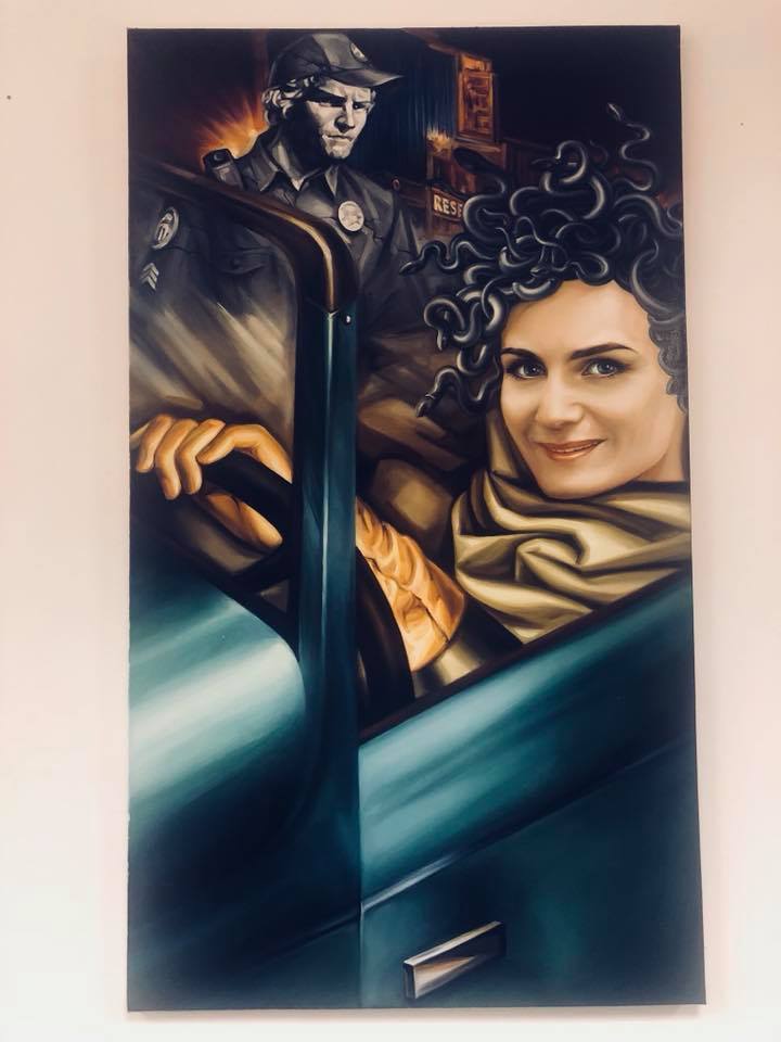 На этот раз с виртуального молотка уйдет картина, на которой изображена сама Крюкова со змеями вместо волос (как у Медузы Горгоны) и патрульный полицейский (сама Крюкова назвала его "олицетворением системы" - прим. ред.). Очевидно, это отсылка к ситуации, когда замглавреда "Страны" остановили полицейские, а после в Сеть были слиты ее персональные данные.