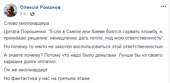 "Слово миллиардера. Цитата Порошенко: "Если в Смеле или Киеве боятся сорвать пломбу, я принимаю решение: немедленно дать тепло, под мою ответственность". Но почему-то никто не захотел воспользоваться этой ответственностью. А знаете почему? Потому что надо было деньгами. Лучше бы из своего кармана долги оплатил. Он же миллиардер! Но фантастика у нас на третьем этаже", - предлагает юрист Алексей Романов.