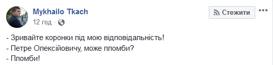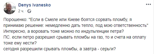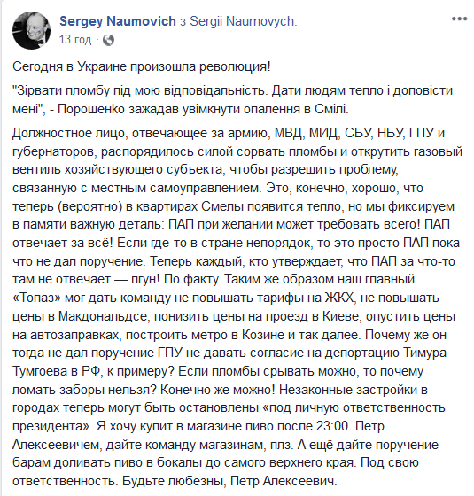 Должностное лицо, отвечающее за армию, МВД, МИД, СБУ, НБУ, ГПУ и губернаторов, распорядилось силой сорвать пломбы и открутить газовый вентиль хозяйствующего субъекта, чтобы разрешить проблему, связанную с местным самоуправлением. Это, конечно, хорошо, что теперь (вероятно) в квартирах Смелы появится тепло, но мы фиксируем в памяти важную деталь: ПАП при желании может требовать всего! ПАП отвечает за всё! Если где-то в стране непорядок, то это просто ПАП пока что не дал поручение. Теперь каждый, кто утверждает, что ПАП за что-то там не отвечает - лгун! По факту. Таким же образом наш главный "Топаз" мог дать команду не повышать тарифы на ЖКХ, не повышать цены в Макдональдсе, понизить цены на проезд в Киеве, опустить цены на автозаправках, построить метро в Козине и так далее. Почему же он тогда не дал поручение ГПУ не давать согласие на депортацию Тимура Тумгоева в РФ, к примеру? Если пломбы срывать можно, то почему ломать заборы нельзя? Конечно же можно! Незаконные застройки в городах теперь могут быть остановлены "под личную ответственность президента". Я хочу купит в магазине пиво после 23:00. Петр Алексеевичем, дайте команду магазинам, плз. А ещё дайте поручение барам доливать пиво в бокалы до самого верхнего края. Под свою ответственность. Будьте любезны, Петр Алексеевич", - написал пользователь.