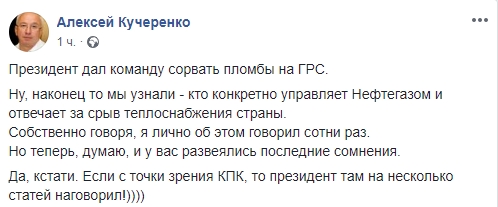 Экс-министр ЖКХ Алексей Кучеренко пишет: "Президент дал команду сорвать пломбы на ГРС. Ну, наконец то мы узнали - кто конкретно управляет Нефтегазом и отвечает за срыв теплоснабжения страны.
