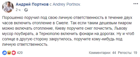 Юрист Андрей Портнов считает, что это заявление - дешевый пиар: "Порошенко поручил под свою личную ответственность в течение двух часов включить отопление в Смеле. Так если таким дешевым пиаром можно включать отопление, Киеву поручите снег почистить, Львову мусор поубирать, а Тернополю включить фонари на дорогах. Ну и чтоб солнце в другую сторону закрутилось, поручите кому-нибудь под личную ответственность".