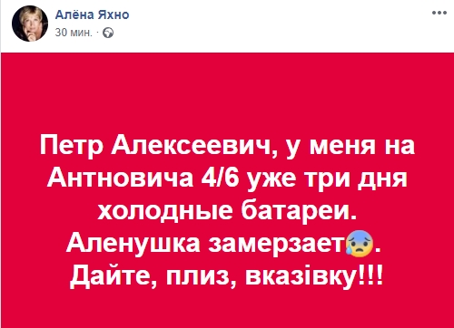Журналист Алена Яхно, у которой нет воды из-за недавнего ЧП на Руставели в Киеве, просит Порошенко дать указание включить отопление на ее улице: "Петр Алексеевич, у меня на Антновича 4/6 уже три дня холодные батареи. Аленушка замерзает.  Дайте, плиз, вказівку!!!"