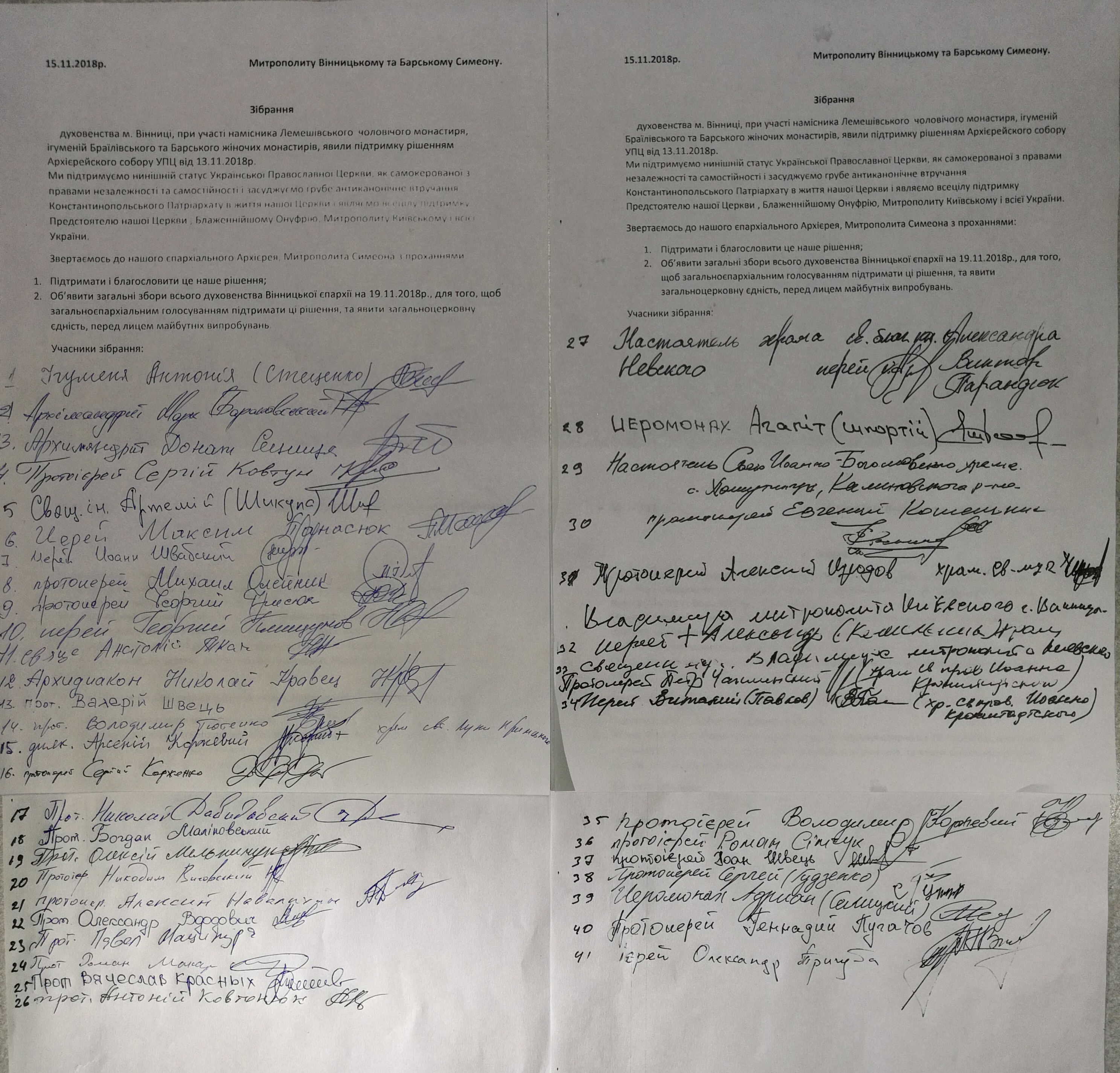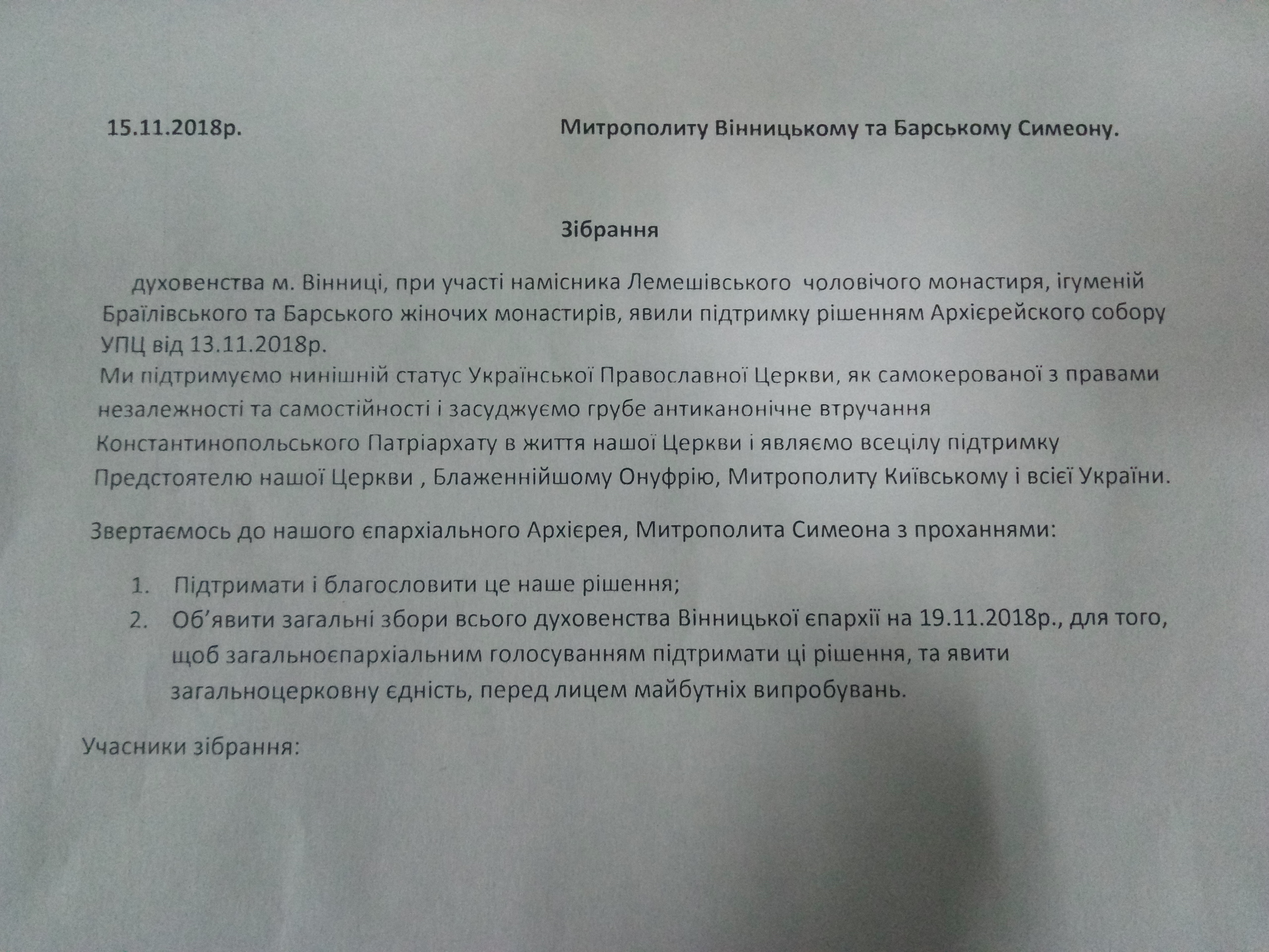 Обращаясь к митрополиту Симеону, священники предлагают ему созвать общее собрание всей Винницкой епархии на 19 ноября с тем, чтобы "общеепархиальным голосованием поддержать решения (архиерейского собора) и явить всецерковное единство перед лицом будущих испытаний".