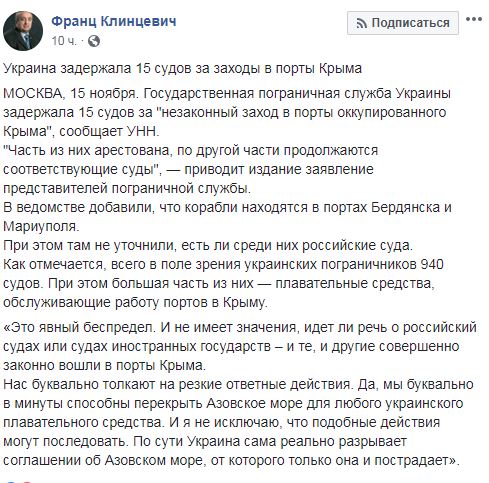В России в ответ на задержание 15 судов украинскими пограничниками за посещение портов Крыма заявили, что Украина сама реально разрывает соглашения об Азовском море. Об этом заявил член комитета по обороне и безопасности Совета Федерации России Франц Клинцевич на своей странице Facebook.
