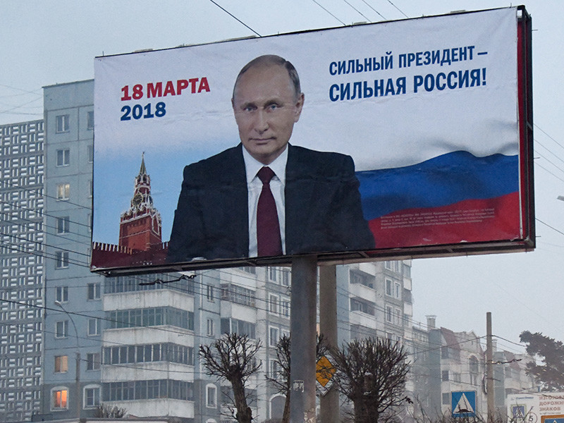 На выборах президента РФ, которые прошли весной, слоганом Владимира Путина тоже было: "Сильный президент - сильная Россия". Российский президент почти не проводил кампанию по наружной рекламе - этот лозунг был единственным. Он сопровождался фотографией Путина на фоне триколора и датой выборов - 18 марта.