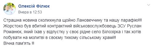 Священник Алексей Филюк в Facebook написал, что погибшим оказался житель Тернопольской области Руслан Романюк. "Страшная новость всколыхнула Лановеччину и наш приход! Жестоко был убит контрактный военнослужащий ВСУ Руслан Романюк, который ехал в отпуск в свое родное село Белозерка", – отметил Филюк.