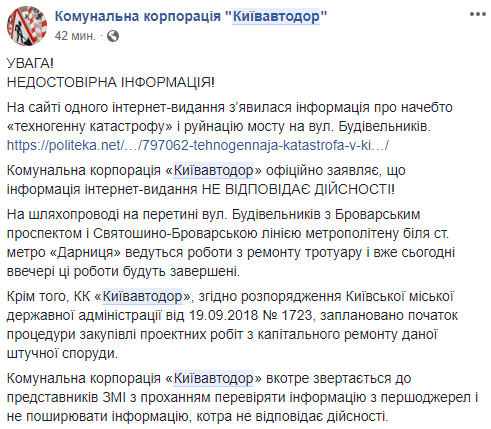 В Киеве у метро "Дарница" провалился мост, его починят только к вечеру