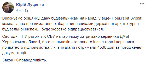 "Сегодня Генпрокуратура совместно с СБУ с поличным задержала руководителя ГАСИ Херсонской области, его сообщников - главного инспектора и руководителя частного предприятия, которые вымогали и получили $4500 за согласование документации", - указано на странице Юрия Луценко в Facebook в пятницу, 16 ноября.