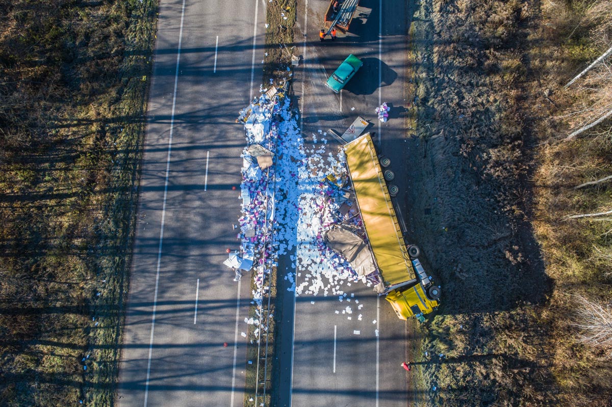 В пятницу, 16 ноября, на 76-м километре Житомирской грузовик DAF снес несколько метров отбойника и перевернулся. Машина, которая везла офисную бумагу, перевернулась поперек дороги, вследствие чего движение по части трассы оказалось перекрыто. Авария произошла около 6:20. Информатор сфотографировал с высоты перевернутый посреди дороги тягач.