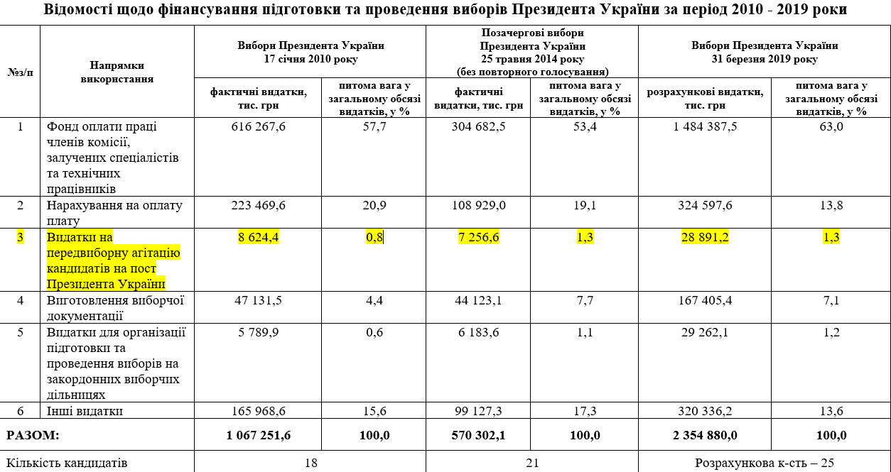 Но главные цифры – это компенсируемые государством расходы на агитацию. Они равномерно распределяются на всех кандидатов. И фейковых, и настоящих. На эти цели уже предусмотрено почти 29 миллионов гривень – чуть больше миллиона на каждого кандидата. На двух предыдущих выборах эта сумма не превышала 8 миллионов.