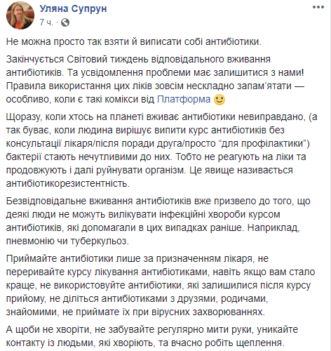Исполнитель обязанностей министра здравоохранения Украины Ульяна Супрун советует не прерывать курс лечения антибиотиками, даже если стало лучше. Об этом она написала на своей странице в Facebook.