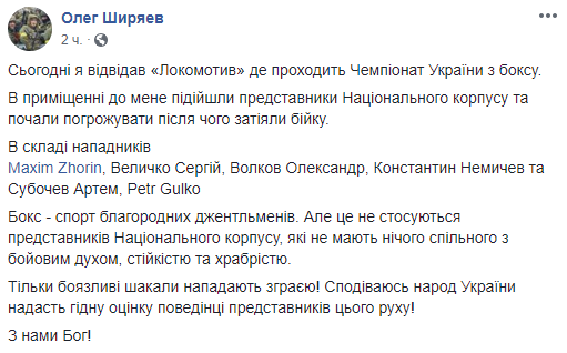 "Сегодня я посетил "Локомотив", где проходит Чемпионат Украины по боксу. В помещении ко мне подошли представители Национального корпуса и начали угрожать, после чего затеяли драку", - написал Ширяев на своей странице в Facebook.