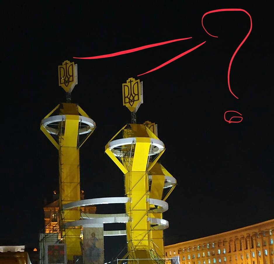 На Майдане в центре Киева власти установили странные конструкции с трезубцами и крестами к годовщине Дня достоинства и свободы. Фото сооружений, выложенное горожанами в Facebook, вызвало споры среди пользователей Сети.