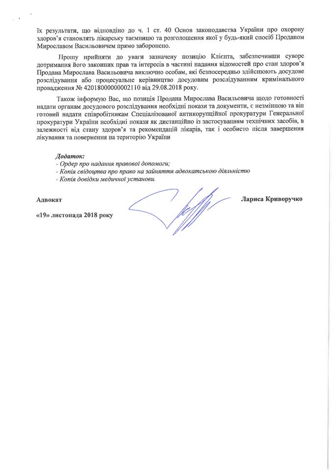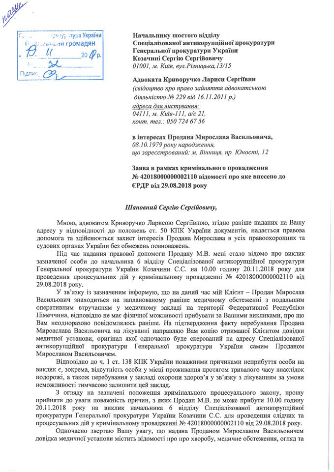 Бывший исполняющий обязанности главы Государственной фискальной службы (ГФС) Мирослав Продан, который подозревается в незаконном обогащении, исключает свою явку на допрос в Специализированную антикоррупционную прокуратуру (САП) 20 ноября в связи с пребыванием на лечении за границей.