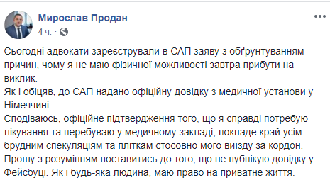 "Сегодня адвокаты зарегистрировали в САП заявление с обоснованием причин, почему я не имею физической возможности завтра прибыть на вызов. Как и обещал, в САП предоставлена официальная справка из медицинского учреждения Германии. Надеюсь, официальное подтверждение того, что я действительно нуждаюсь в лечении и нахожусь в медицинском учреждении, положит конец всем грязным спекуляциям и слухам о моем выезде за границу", - написал он.