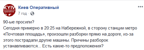 "90-ые просили?  Сегодня примерно в 20:25 на Набережной, в сторону станции метро Почтовая площадь, произошли разборки прямо на дороге, из-за этого пострадали другие машины. Причины разборок устанавливаются...", - сообщил ресурс.