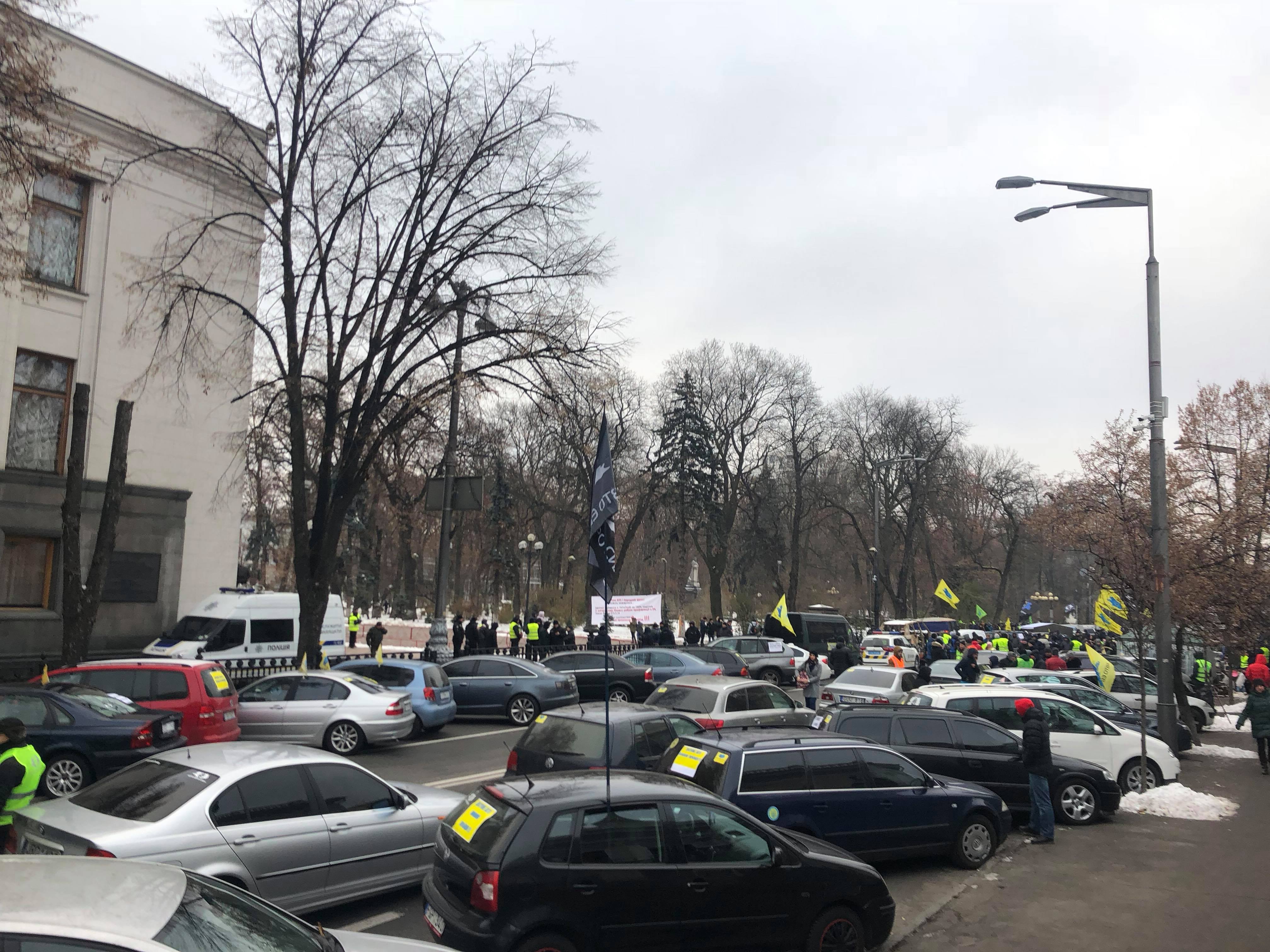 Сейчас на месте находится около 100 автомобилей. Также на месте присутствует сожженный после принятия законов №8487 и 8488 Lend Rover лидера общественного движения "АвтоЕвроСила" Олега Ярошевича. Ранее он уже анонсировал, что это авто станет "символом несогласия с теми антинародными законами, которые приняли депутаты". Люди, проходя мимо сгоревшей машины, шутят: "Хоть бы резину снял. Сейчас бы сожгли".