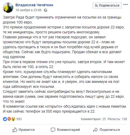 Однако совладелец и основатель интернет-магазина Rozetka.ua Владислав Чечеткин на своей странице в Facebook отмечает, что принятие этого закона - "прямое продолжение истории с запретом посылок дороже 22 евро". По его данным, инициаторами данных изменений Налогового кодекса являются те же люди, которые "решили сыграть многоходовку".