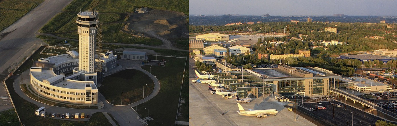 Фото: Донецкий аэропорт им. Прокофьева после реконструкции в 2012 году, на фото слева диспетчерская вышка