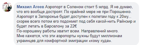 В комментариях говорят о том, что вряд ли аэропорт заработает: "Аэропорт в Соленом стоит 5 млрд. Я не думаю, что его вообще достроят. По крайней мере не при Порошенко.  Аэропорт в Запорожье будет доступен к полетам году к 20му... скорее всего потом его подожмет под себя какой-нить Райнэир и будет летать в Барселону за 22€.