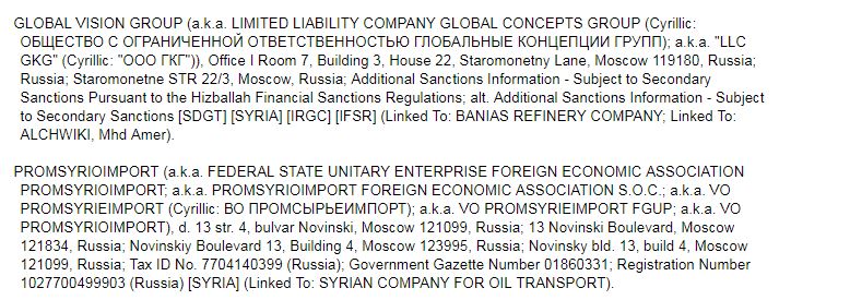"Промсырьеимпорт" находится в собственности российского государства. Оно подведомственно Министерству энергетики России. Фирма Global Vision Group названа в сообщении Минфина США российской компанией, которая принадлежит сирийскому бизнесмену Мохамеду Альшвики.