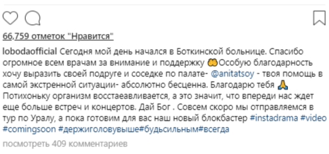 "Сегодня мой день начался в Боткинской больнице. Спасибо огромное всем врачам за внимание и поддержку. Особую благодарность хочу выразить своей подруге и соседке по палате Аните Цой - твоя помощь в самой экстренной ситуации абсолютно бесценна. Благодарю тебя", - говорится в ее сообщении.