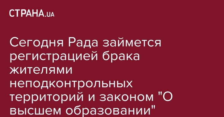 Первым в повестке дня значится рассмотрение в первом чтении законопроекта №8400 "О внесении изменений в некоторые законодательные акты Украины относительно регистрации брака граждан, проживающих на временно оккупированной территории". Если депутаты проголосуют за него в двух чтениях, лица, проживающие в ОРДЛО, смогут зарегистрировать брак в день подачи заявления о его регистрации.