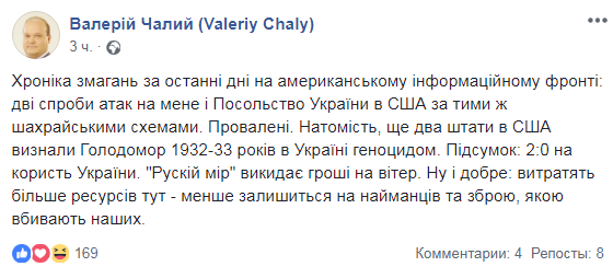 "Хроника состязаний за последние дни на американском информационном фронте: две попытки атак на меня и посольство Украины в США по тем же мошенническим схемам. Провалены", - указано на странице Чалого.