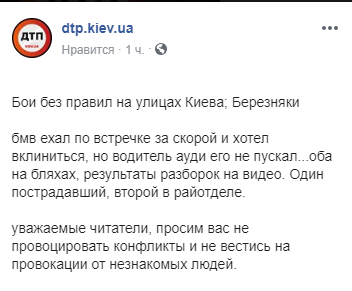 "Бои без правил на улицах Киева; Березняки. BMW ехал по встречке за скорой и хотел вклиниться, но водитель Audi его не пускал...оба на бляхах, результаты разборок на видео. Один пострадавший, второй в райотделе", - говорится в сообщении.