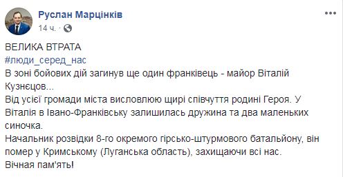 В зоне проведения Операции объединенных сил (ООС) погиб офицер разведки, майор Вооруженных сил Украины Виталий Кузнецов из Ивано-Франковска. Об этом на своей странице в Facebook сообщил мэр Ивано-Франковска Руслан Марцинкив.