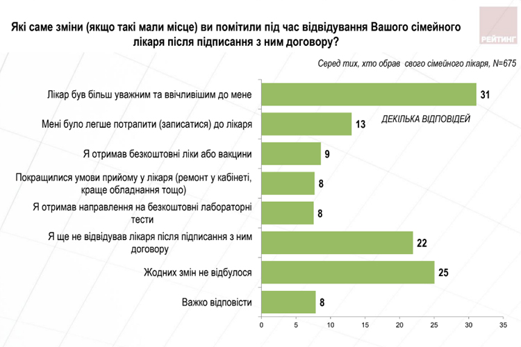 Оказалось, что 56% украинцев уже выбрали своего семейного врача. Треть респондентов (31%) высоко оценили уровень профессионализма и компетентности врачей в Украине. В то же время, в июне таких опрошенных было 39%. Почти две трети заявили о том, что знают своего семейного врача или терапевта. 42% опрошенных еще не подписали договор с семейным врачом. Быстрее определились с терапевтом в западных и восточных макрорегионах, женщины и старших по возрасту люди.