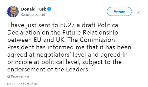 "Я направил 27 странам ЕС проект политической декларации о будущих отношениях между ЕС и Соединённым Королевством. Глава Еврокомиссии проинформировал меня, что она была одобрена на уровне переговорщиков и согласована в принципе на политическом уровне, при условии одобрения лидерами (вероятно главами ЕС и Великобритании - Прим.Ред.)", - написал в Twitter Туск.