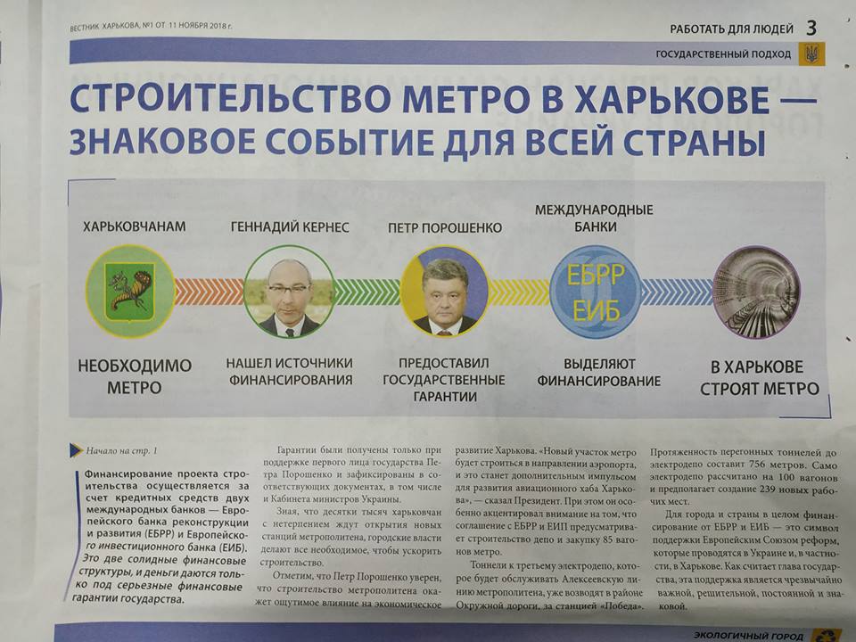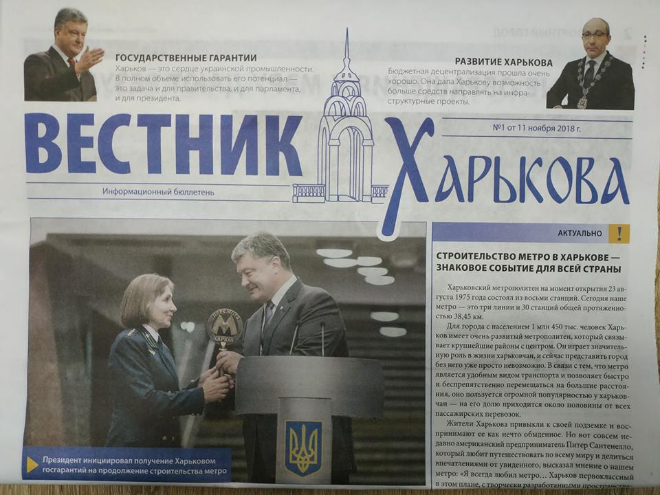 Житель Харькова Владимир Рисенко показал на своей странице в соцсети изображение газеты "Вестник Харькова", которая, судя по всему, имеет превыборную направленность. На первой полосе изображены президент Украины Петр Порошенко и мэр города Геннадий Кернес.