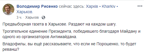 "Предвыборная газета в Харькове. Раздают на каждом шагу. Трогательное единение президента, победившего благодаря Майдану, и одного из организаторов Антимайдана (автор имеет в виду Геннадия Кернеса - прим. ред.). Владофилы, вы ещё рассказываете, что если не Порошенко, то будет реванш?" - задается вопросом Рисенко.