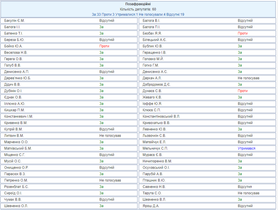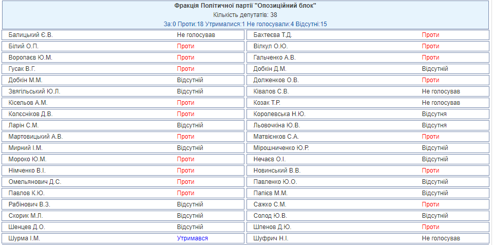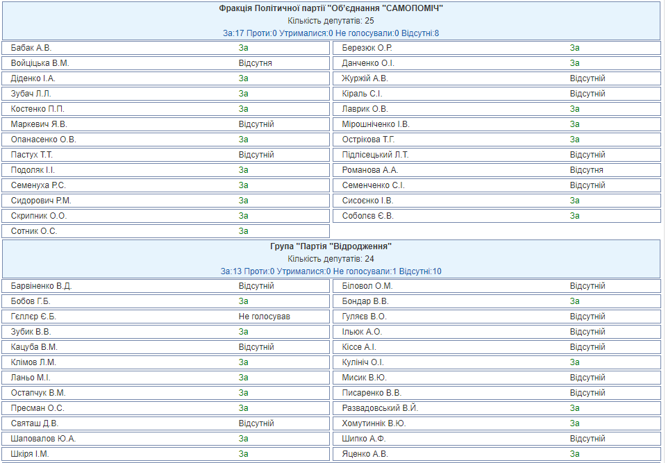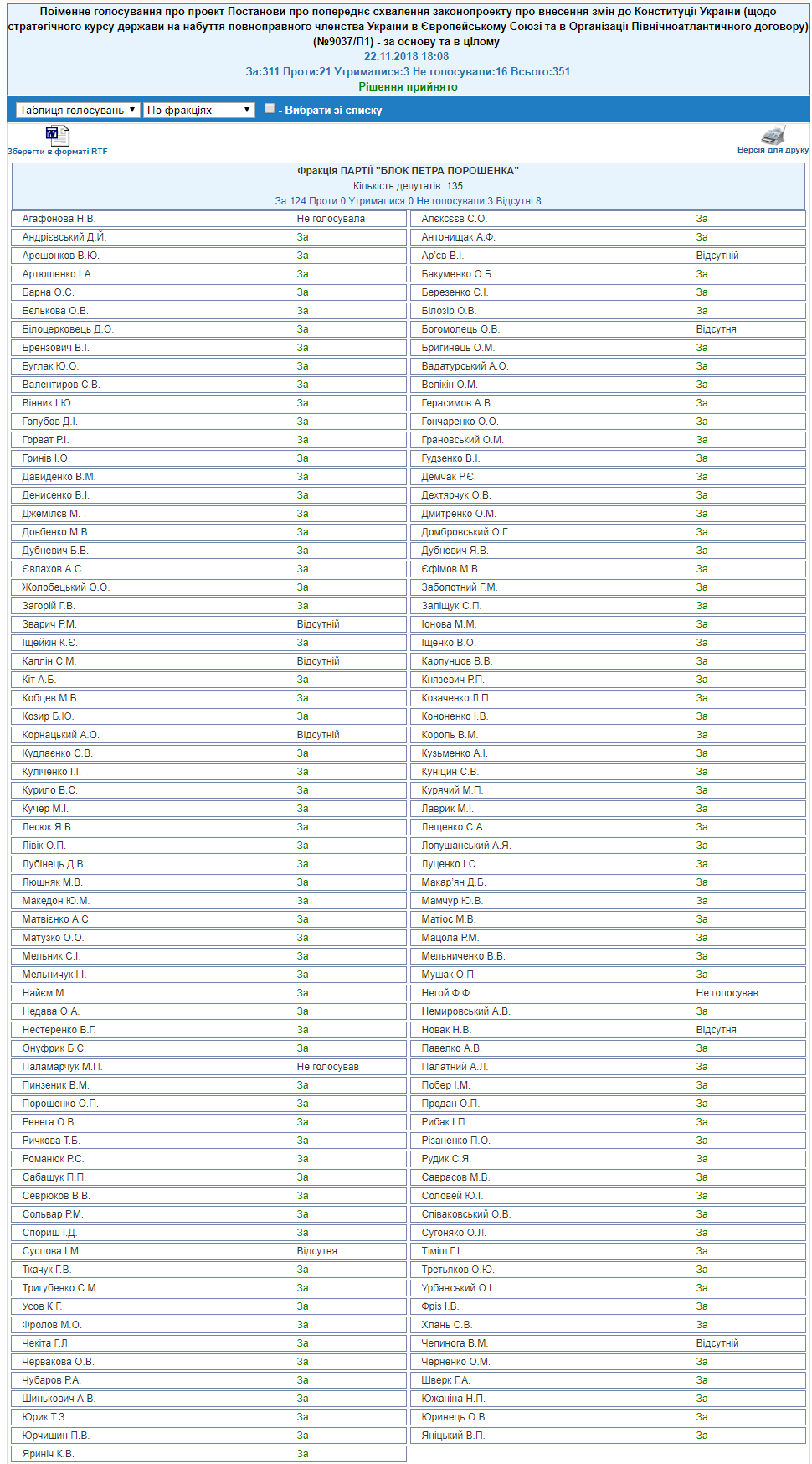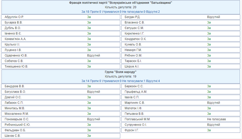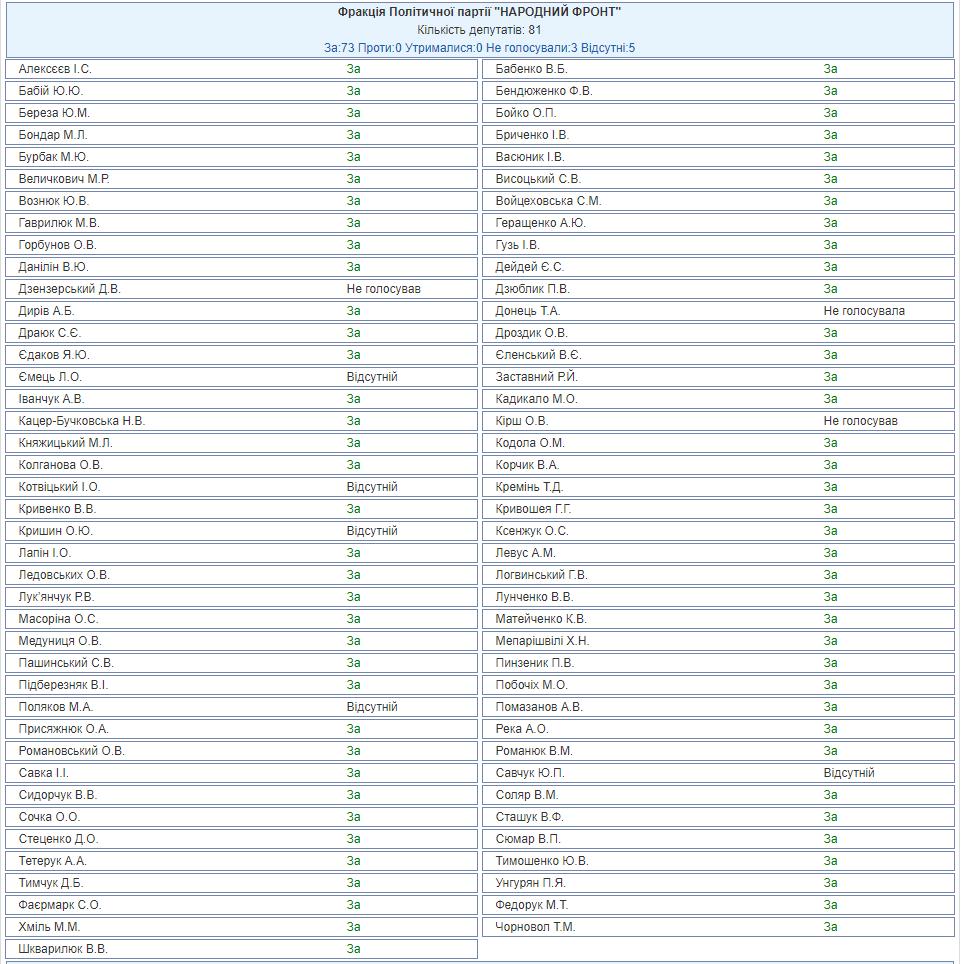 На сайте Рады появился список проголосовавших. Известно, что в БПП проголосовали 124 депутата. В Народном фронте - 73, среди внефракционых сразу 33  депутата из 60 поддержали инициативу. Оппозиционный блок проголосовал против.