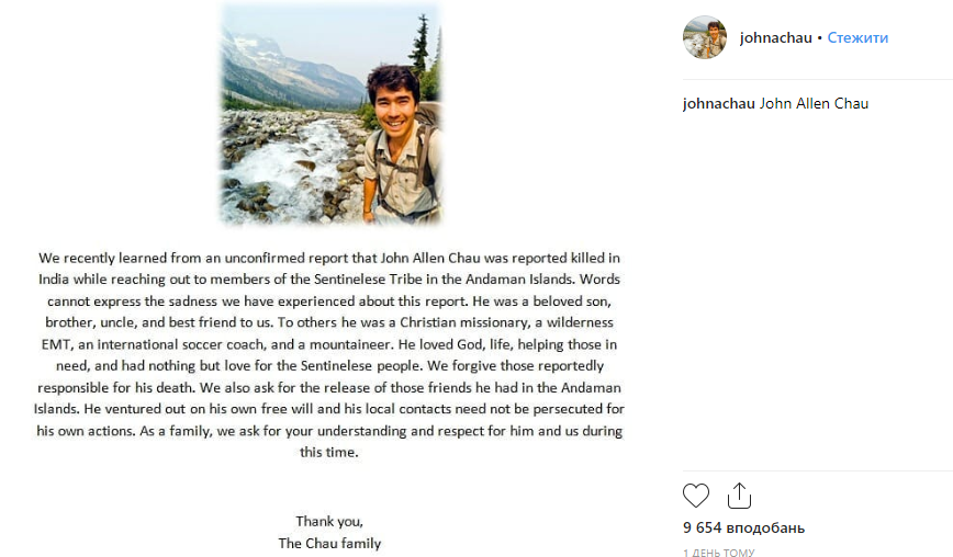 Родные Джона Чау опубликовали в его инстаграме пост о его смерти. Они попросили освободить задержанных по делу о его убийстве, поскольку те "не должны быть наказаны за его действия".