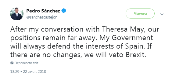 "Мое правительство всегда будет защищать интересы Испании. Если не будет изменений, мы наложим вето на соглашение по Brexit", – отметил испанский премьер.