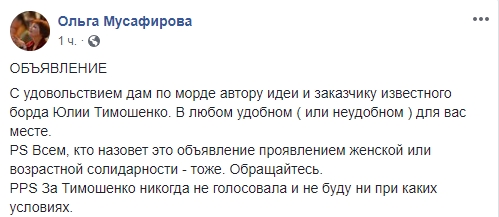 Журналист Ольга Мусафирова также возмущена формулировкой о старушке: "С удовольствием дам по морде автору идеи и заказчику известного борда Юлии Тимошенко. В любом удобном (или неудобном) для вас месте.