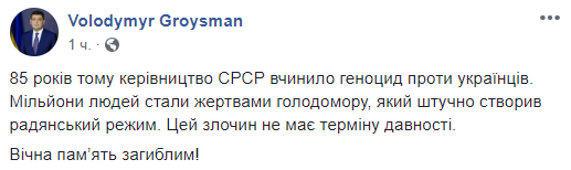 Премьер-министр Украины Владимир Гройсмана написал: "85 лет назад руководство СССР допустило геноцид против украинского народа. Миллионы людей стали жертвами голодомора, искусственно создал советский режим. Это преступление не имеет срока давности".