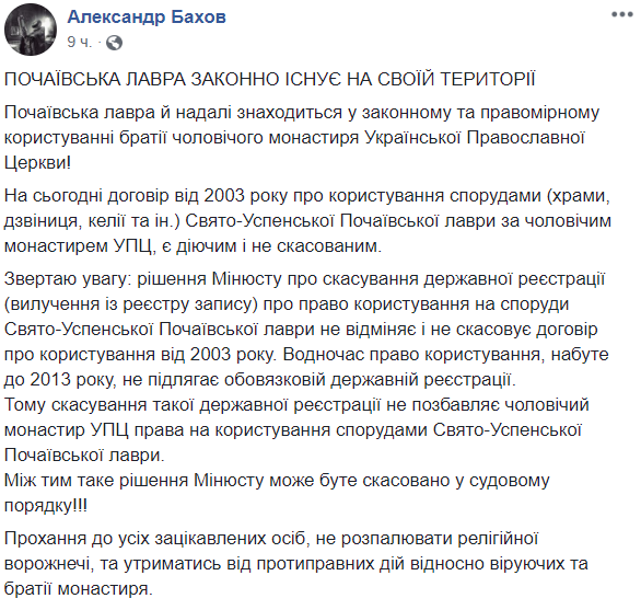 По его словам, право пользования, приобретенное до 2013 года, не подлежит обязательной государственной регистрации. "Поэтому отмена такой государственной регистрации не лишает мужской монастырь УПЦ права пользования сооружениями Свято-Успенской Почаевской лаврой", - считает Бахов..