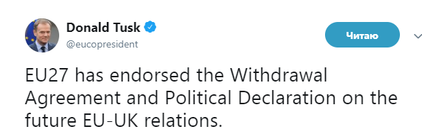 В воскресенье, 25 ноября, на внеочередном саммите в Брюсселе 27 государств Европейского союза одобрили соглашение о выходе Великобритании из ЕС. Об этом в Twitter написал президент Европейского Совета Дональд Туск.