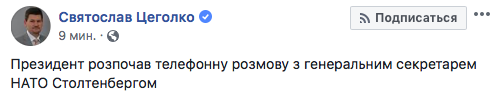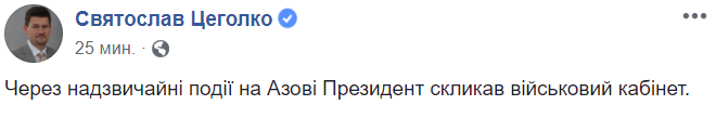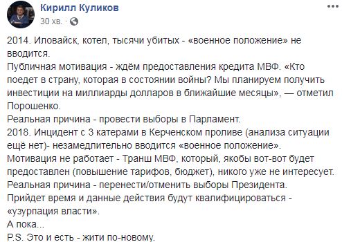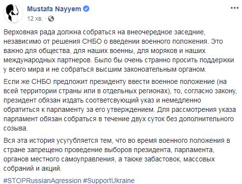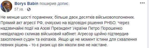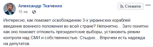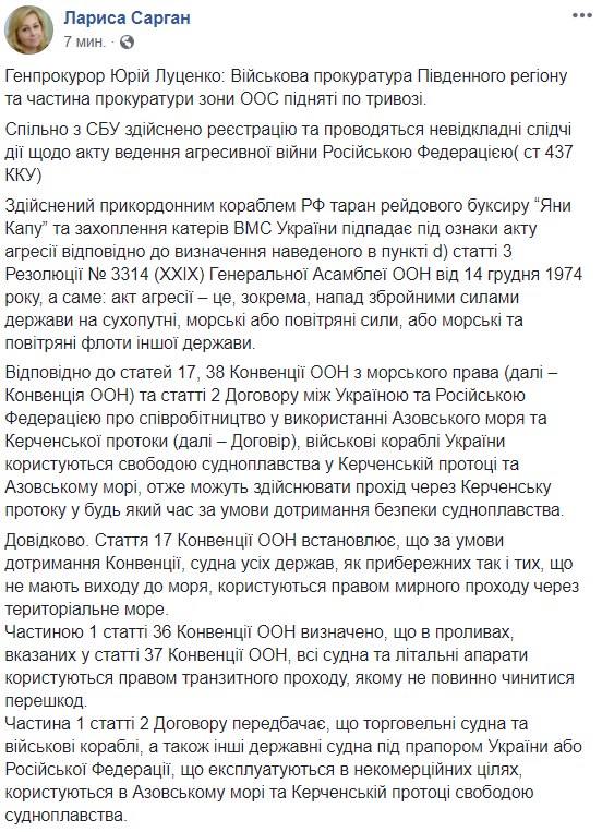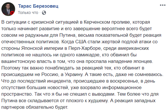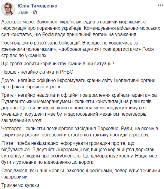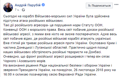 22:31  "Три корабля ВМС обстреляны и захвачены российским флотом близ Керченского пролива. Много часов наши корабли подвергались преследованию. Россия закрыла Керченский пролив. Над Керченским мостом летают российские боевые самолёты.