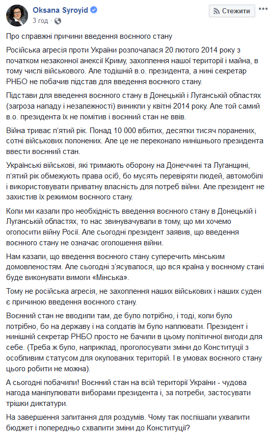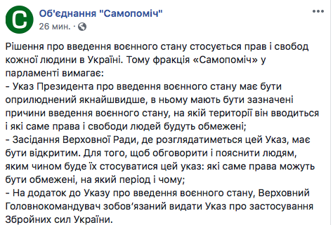 "Решение о введении военного положения касается прав и свобод каждого человека в Украине. Поэтому фракция "Самопомощь" в парламенте требует: