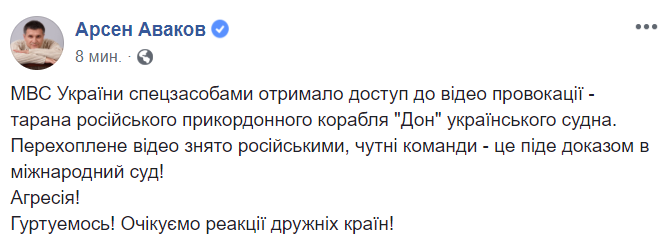 21:25  Арсен Аваков написал, что видео тарана украинской баржи судном "Дон" попало в руки МВД "спецсредствами". Отметим, что ранее оно было опубликовано на российском телеканале "Звезда". Так что или министр неудачно пошутил, или его неправильно информировали.