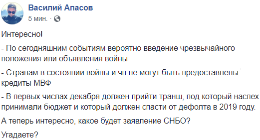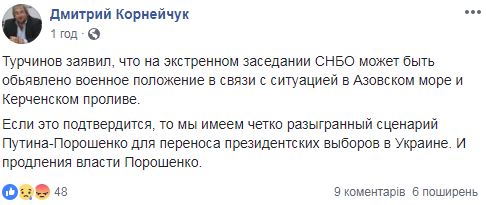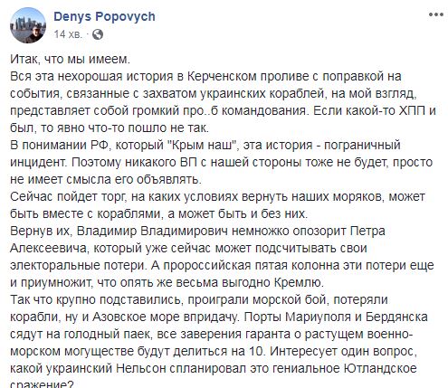 23:04 Блогер и военный эксперт Денис Попович пишет, что обострение в Керченском проливе на самом деле является "про...ом (эвфемизм слова "прокол" - прим. ред.) украинского командования".