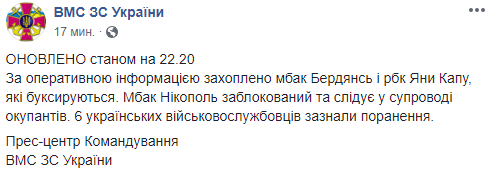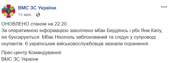 22:44  Уточненные данные от командования ВМС Украины. Захвачены на буксир только "Бердянск" и буксир. Катер "Никополь" следует в окружении шести кораблей ЧФ РФ. При этом сообщается о шести раненых украинцах.